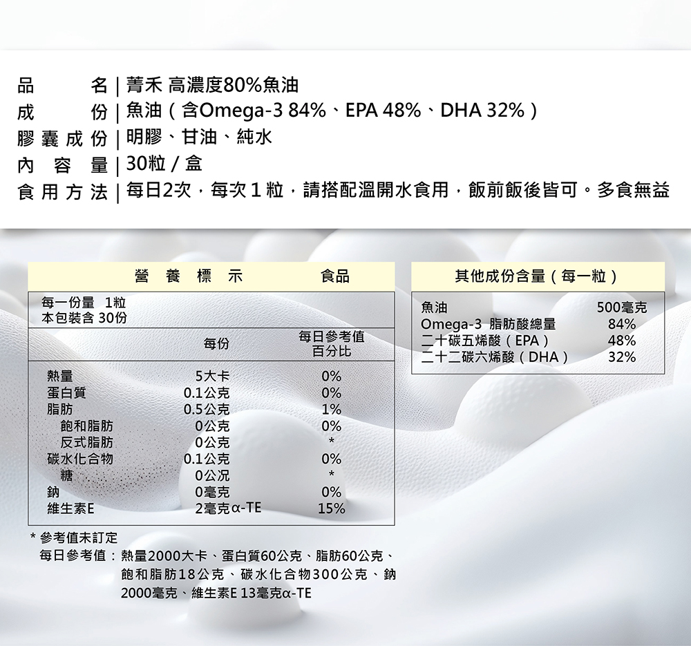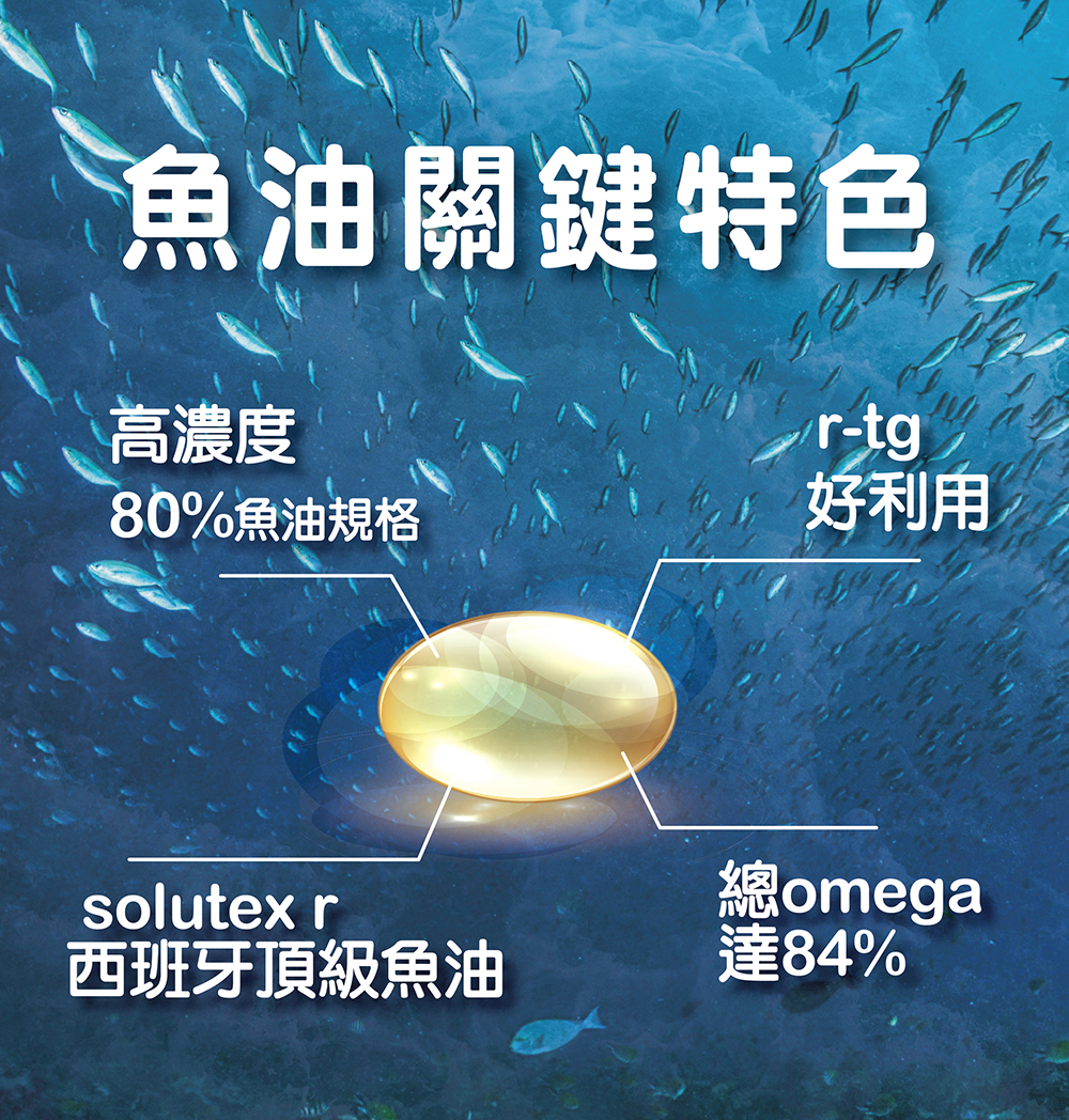 成 份:魚油(含Omega-3 84%、EPA 48%、DHA 32%)